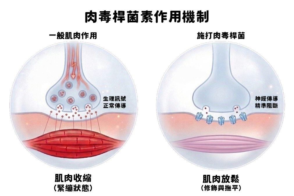 當我們的表情太豐富或是肌肉過度出力時,神經會頻繁發送訊號讓肌肉緊繃,進而擠壓出皺紋或是讓臉部線條顯得生硬。肉毒桿菌素能精準地暫時阻斷這些訊號,讓肌肉進入暫時放鬆休息的狀態,不僅能自然撫平因大笑或皺眉產生的動態紋路,更能修飾因肌肉發達而造成的突兀線條。