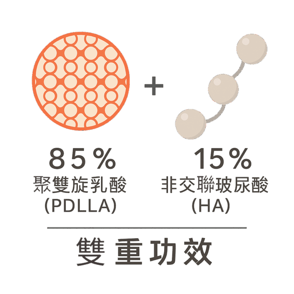 結合85%聚雙旋乳酸(PDLLA)和15%非交聯玻尿酸(HA)的雙重功效: