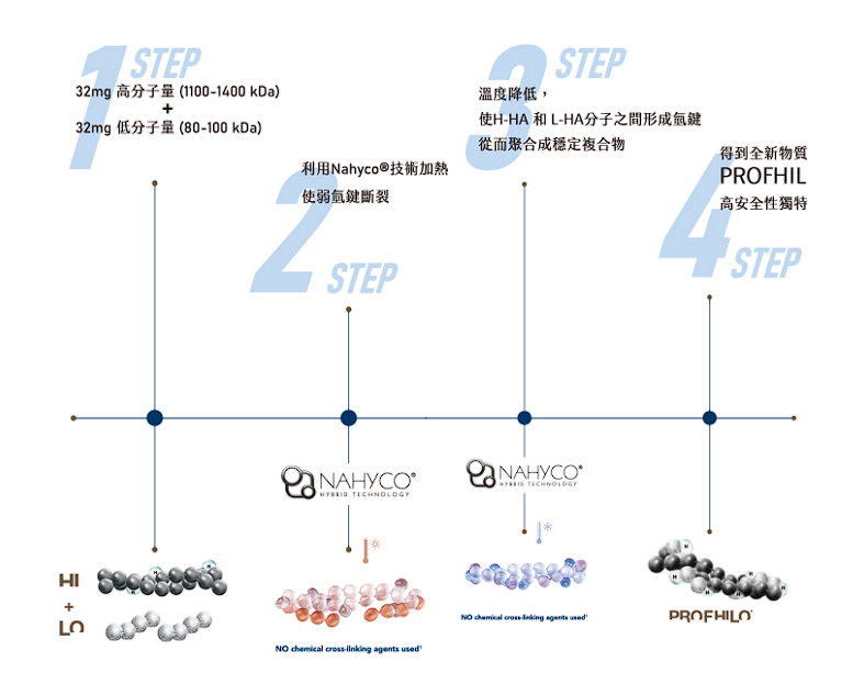 NAHYCO™ 是 IBSA 原廠開發的專利製程,能在無需添加任何化學交聯劑的情況下,穩定結合兩種不同分子量的玻尿酸: