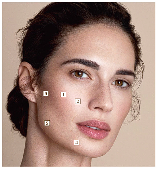 - 5個黃金點位集中於顴骨下方、口周、下顎線等鬆弛明顯區域